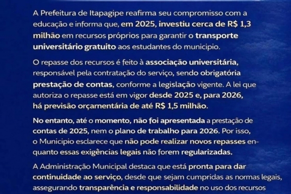 Prefeitura de Itapagipe esclarece pendências no Transporte Universitário