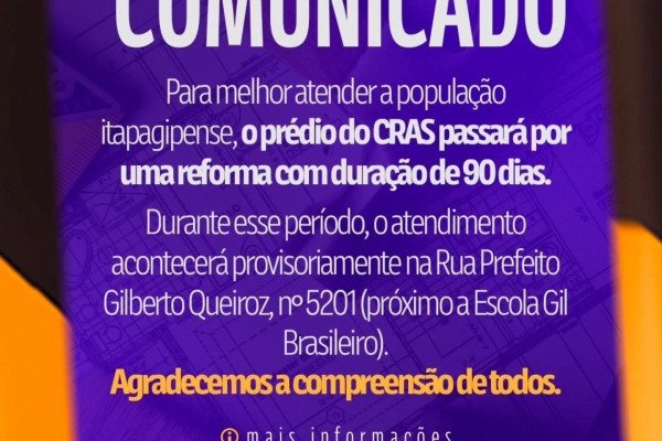 Para melhor atender a população itapagipense, o prédio do CRAS passará por uma reforma com duração aproximada de 90 dias