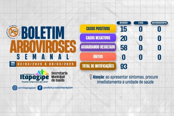 Entre os dias 02 de março a 08 de março, Itapagipe confirmou mais 15 casos positivos de dengue