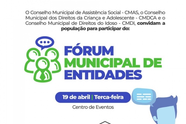 Nesta terça-feira, dia 19 de abril, acontece o Fórum Municipal de Entidades no Centro de Eventos