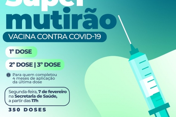 Nesta segunda-feira, dia 07 de fevereiro, acontece mais um supermutirão de vacinação contra a Covid-19.
