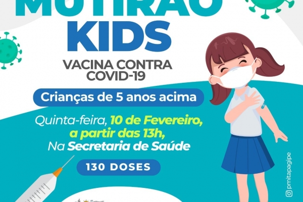 Nesta quinta-feira, dia 10 de fevereiro, acontece mais um mutirão kids para crianças de 5 anos acima sem comorbidades.