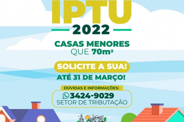 Como feito no ano de 2021, a administração municipal estará realizando a isenção do IPTU no ano de 2022 para casas menor