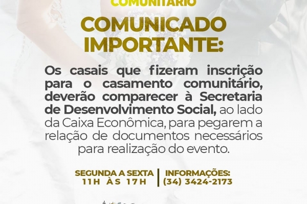 Atenção noivos que se inscreveram para o Casamento comunitário, está aberto o prazo para entrega dos documentos.