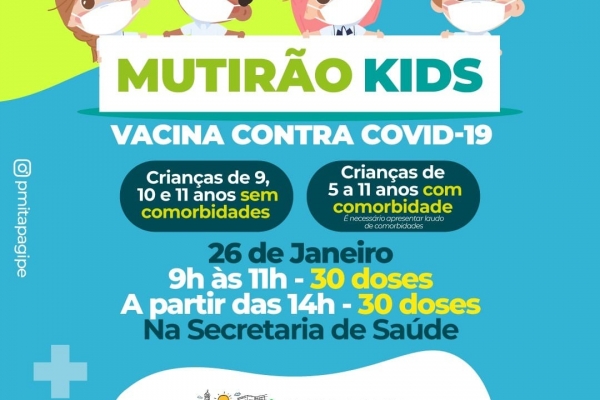 Amanhã, dia 26 de janeiro, acontecerá mais um mutirão kids contra covid-19 para crianças de 5 a 11 anos