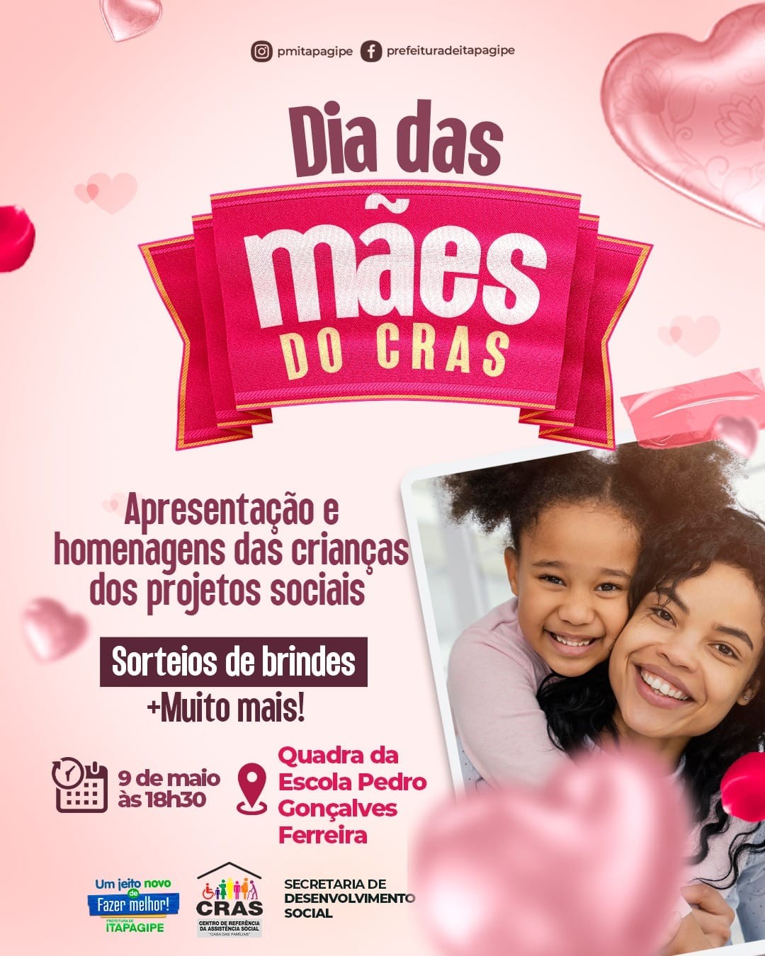 Venha celebrar o Dia das Mães do CRAS, no dia 9 de maio, às 18:30 horas, na quadra da Escola Pedro Gonçalves Ferreira