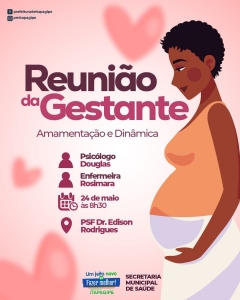 Atenção mamães, nesta quinta-feira, dia 24 de maio, às 8:30, acontece a reunião da gestante no PSF Dr. Edison Rodrigues.