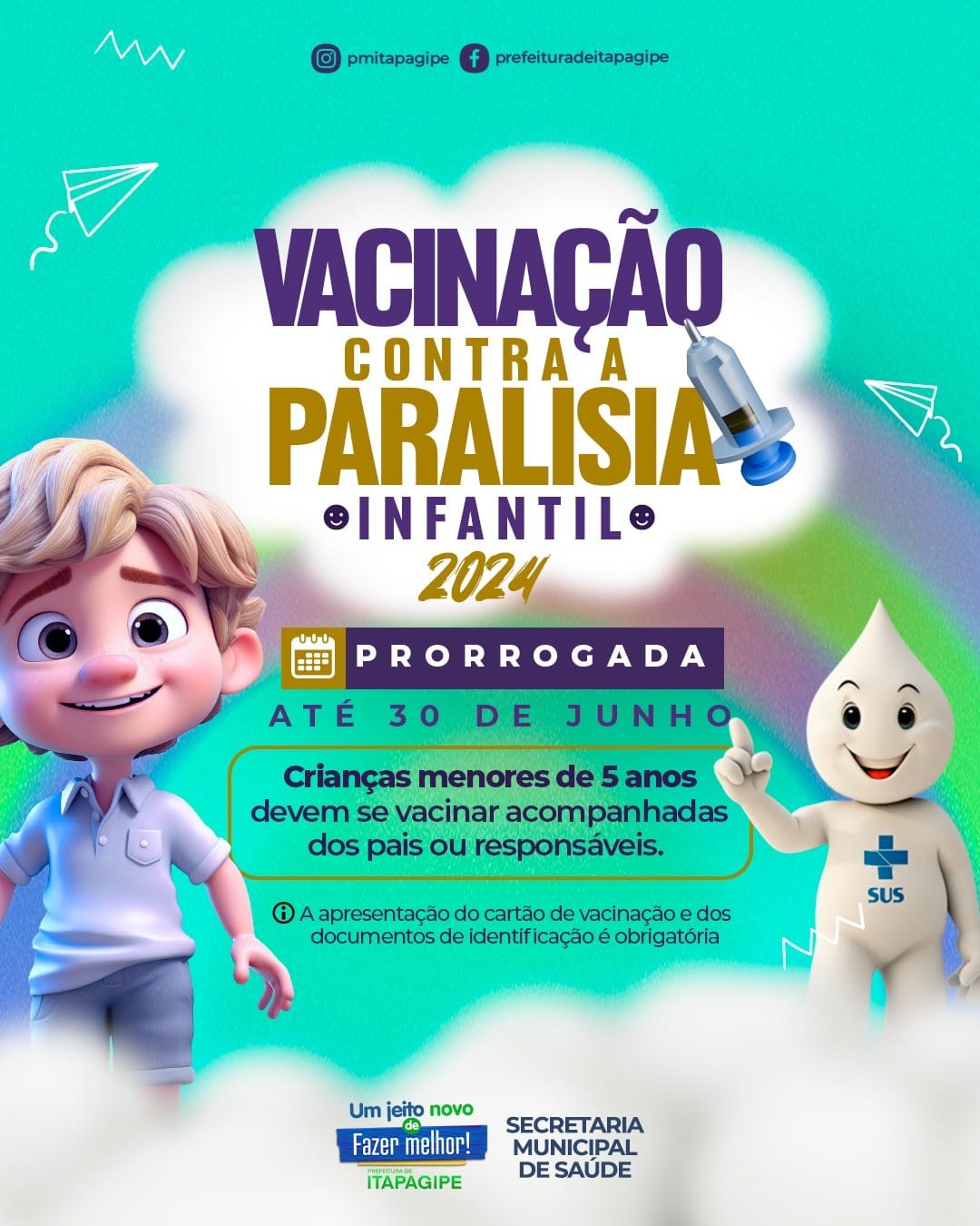 A campanha de vacinação contra a paralisia infantil foi prorrogada até o dia 30 de junho.