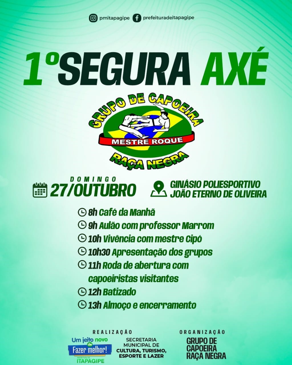 O evento, voltado aos capoeiristas de Itapagipe e região, é uma realização da Prefeitura de Itapagipe e conta com a organização do Grupo de Capoeira Raça Negra.