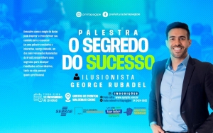 A Prefeitura de Itapagipe, em parceria com o SEBRAE-MG e a Sala Mineira do Empreendedor, tem o prazer de convidar todos para a palestra "O Segredo do Sucesso", com o renomado palestrante e ilusionista George Rubadel.