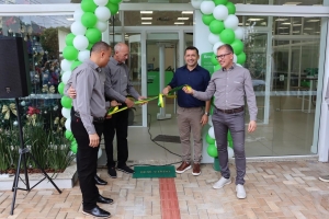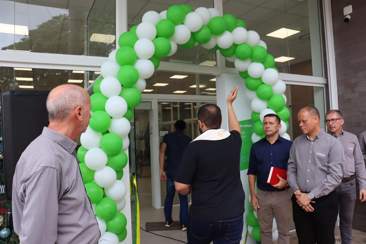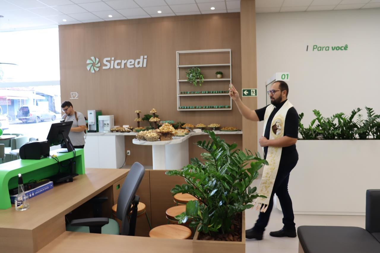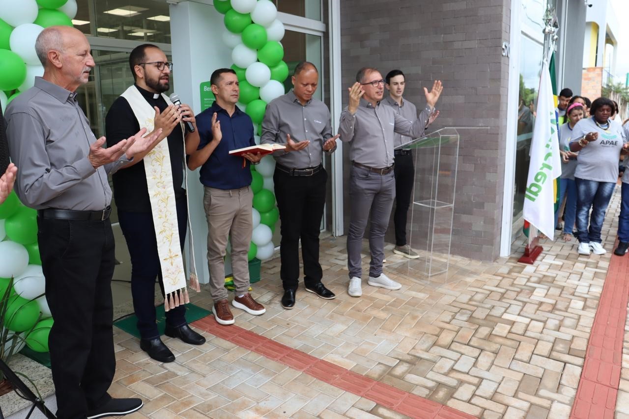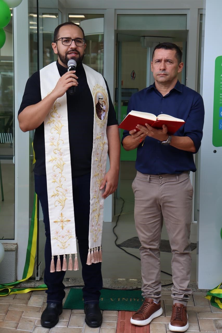 Após o desenlace da fita inaugural, o Padre Maik Alex Savazi realizou uma bênção especial, oficializando a abertura do novo Escritório de Negócios.