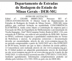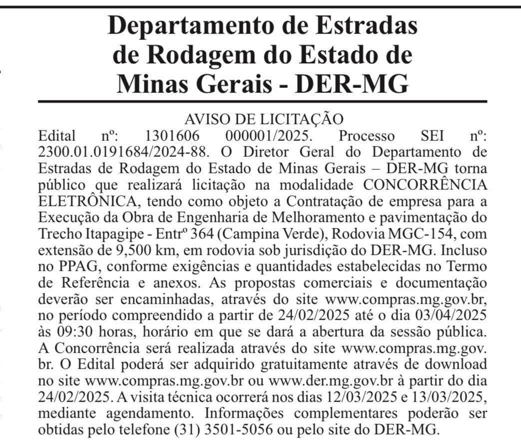 Nesta sexta-feira, dia 21 de fevereiro de 2025, foi publicado o edital do DER/MG para a contratação de uma empresa especializada em pavimentação asfáltica, visando a conclusão da rodovia MGT-154, que liga Itapagipe a Campina Verde.
