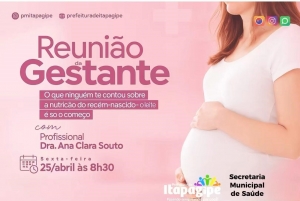 Nesta quinta-feira, dia 25 de abril, a partir das 8:30h, acontecerá a Reunião da Gestante no PSF Dr. Edison Rodrigues.