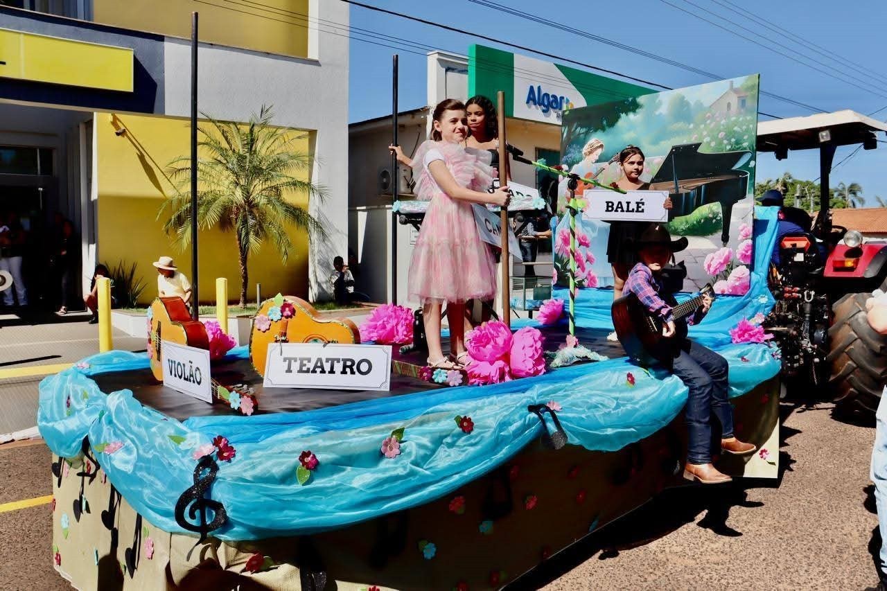 O carro alegórico da Secretaria de Cultura exibiu fotos e instrumentos musicais da Banda Municipal, relembrando sua trajetória e importância para a cultura local.