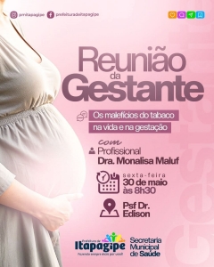 Nesta sexta-feira, dia 30 de maio, a partir das 8:30h, acontecerá a Reunião da Gestante no PSF Dr. Edison Rodrigues.