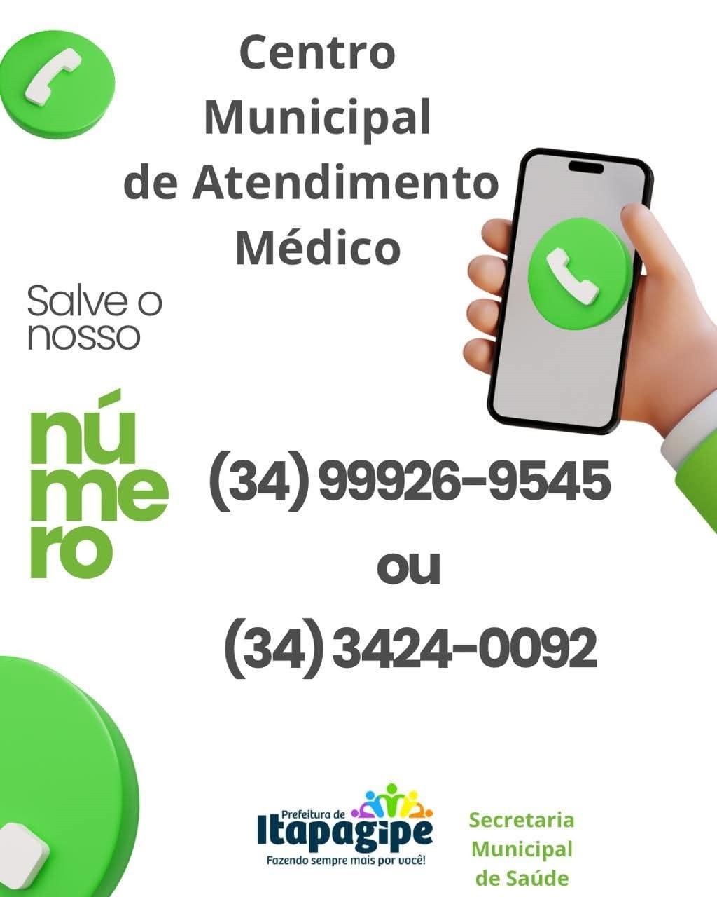 A Prefeitura Municipal de Itapagipe informa que os números de contato do Centro Municipal de Atendimento Médico foram atualizados.