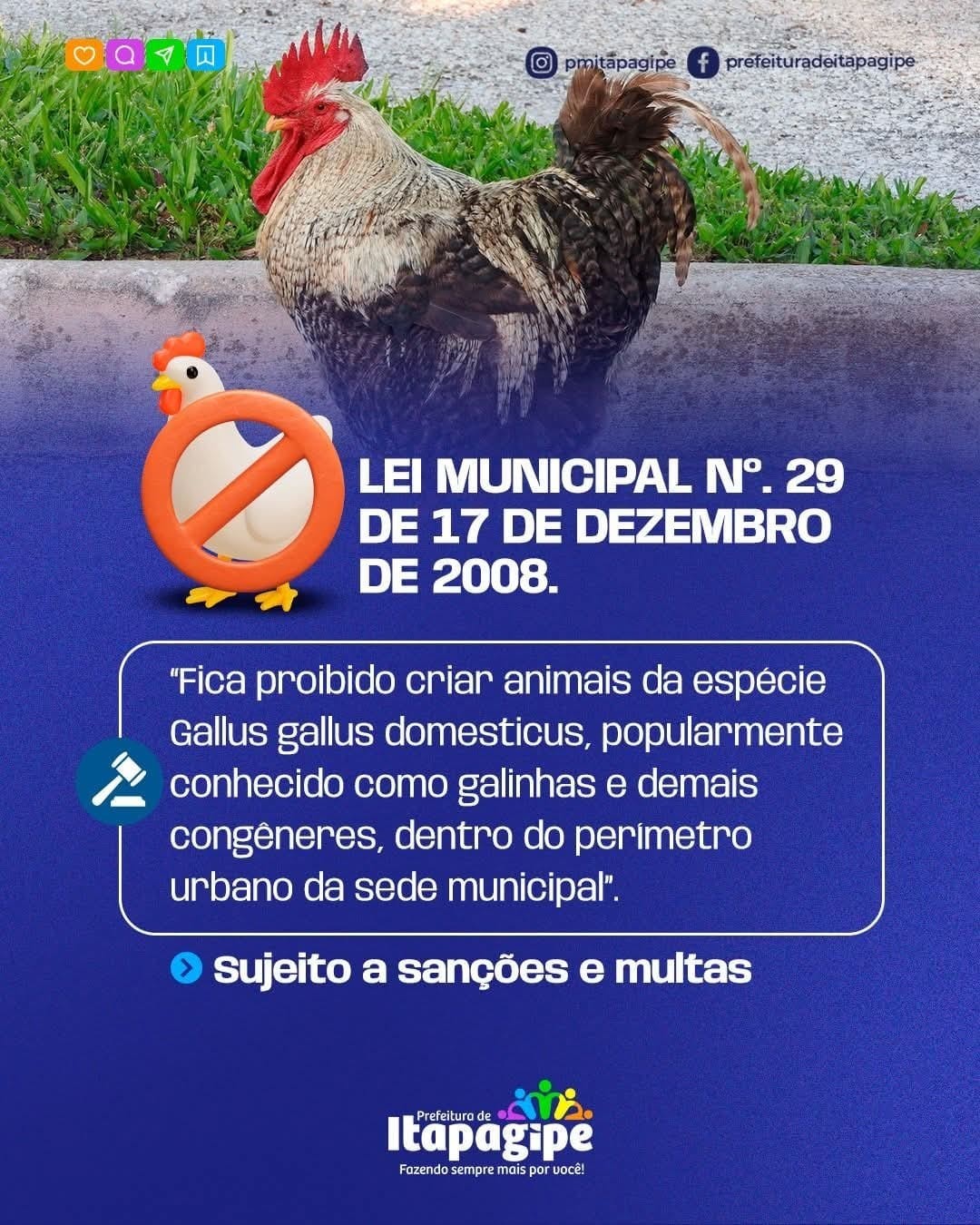A Prefeitura Municipal de Itapagipe reforça à população que é proibida a criação de galinhas, galos e demais aves no perímetro urbano do município.