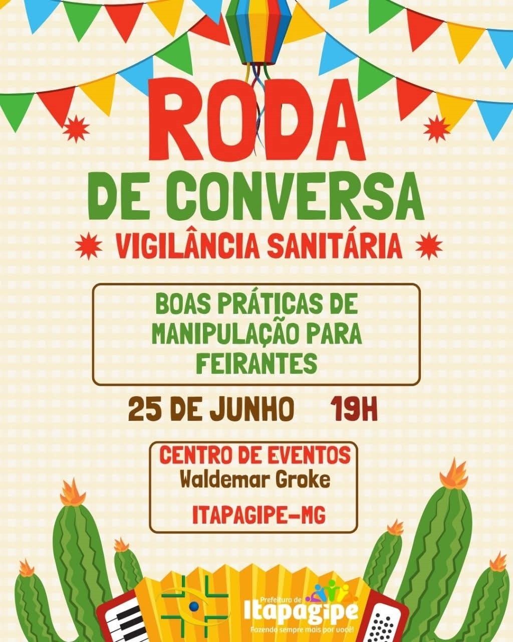 A Prefeitura de Itapagipe, por meio da Vigilância Sanitária, convida todos os feirantes e responsáveis por barracas das festividades juninas para participarem da palestra “Boas Práticas Para Manipulação Para Feirantes”, que será realizada nesta quarta-feira, às 19h, no Centro de Eventos Waldemar Groke.