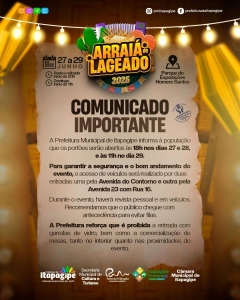 A Prefeitura Municipal de Itapagipe informa à população que os portões do Arraiá do Lageado serão abertos às 18h nos dias 27 e 28 de junho (sexta e sábado), e às 11h no dia 29 (domingo).
