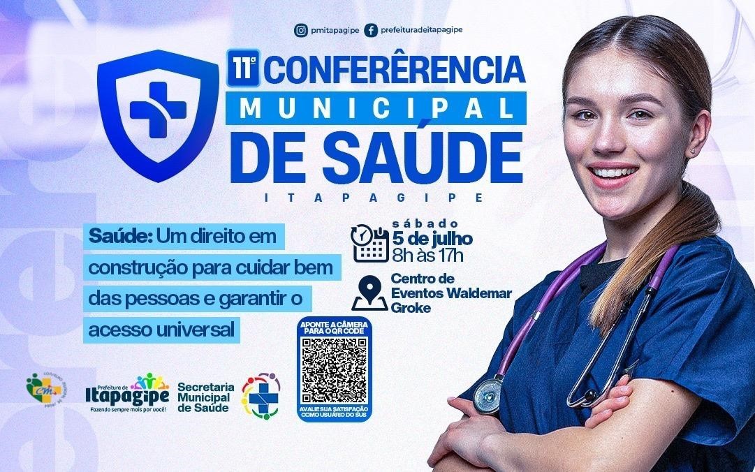 O Conselho Municipal de Saúde e a Secretaria Municipal de Saúde de Itapagipe/MG convidam toda a população para participar da 11ª Conferência Municipal de Saúde, que será realizada no dia 05 de julho de 2025 (sábado), das 8h às 17h, no Centro de Eventos Waldemar Groke, localizado na Rua 10, nº 545 – Centro – Itapagipe/MG.
