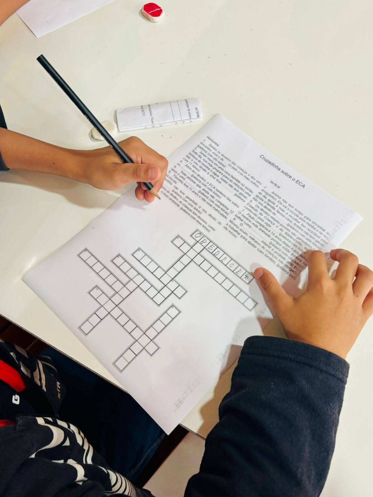 Para finalizar o encontro, foi proposta uma atividade escrita e uma cruzadinha, com o intuito de consolidar o aprendizado e garantir que as crianças e adolescentes não apenas ouvissem, mas também aplicassem o conhecimento adquirido.