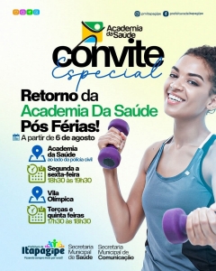 A Prefeitura de Itapagipe e a Secretaria Municipal de Saúde, convida para o retorno das atividades da Academia da Saúde a partir do dia 06 de agosto.
