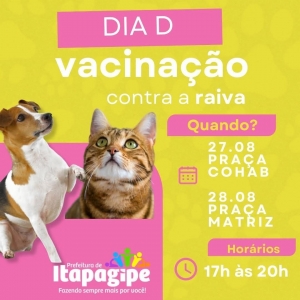 A Prefeitura de Itapagipe, por meio da Secretaria Municipal de Saúde e dos Agentes de Endemias, informa à população que nesta semana serão realizadas ações especiais de Vacinação Antirrábica em dois pontos da cidade: