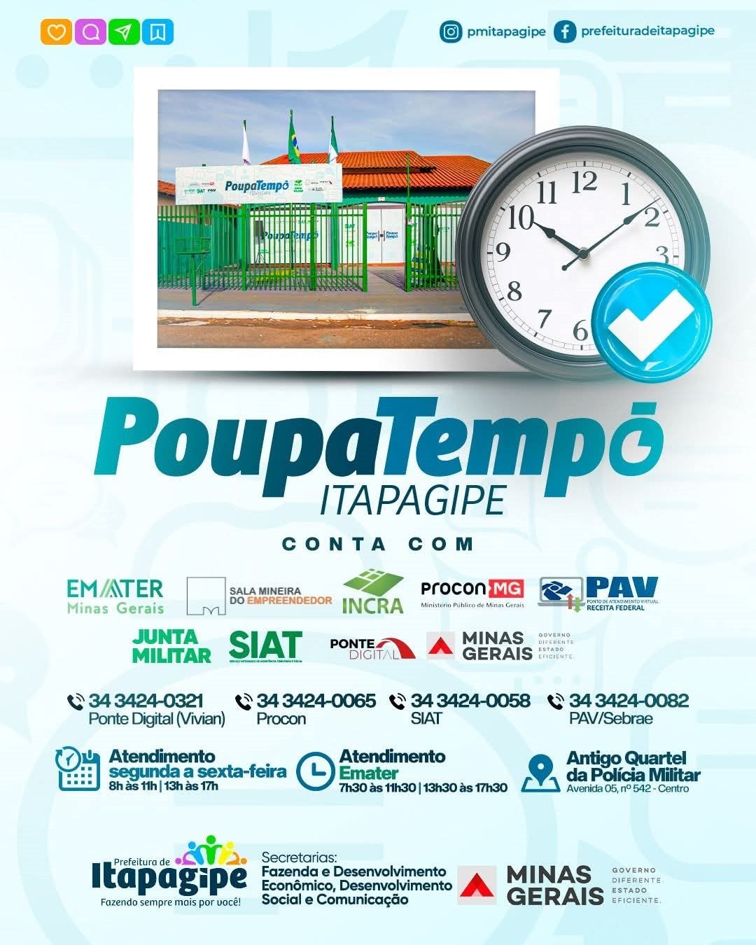 A Prefeitura Municipal informa que o Poupatempo Itapagipe já está atendendo a população no endereço: Avenida 05, nº 542, Centro – antigo Quartel da Polícia Militar.