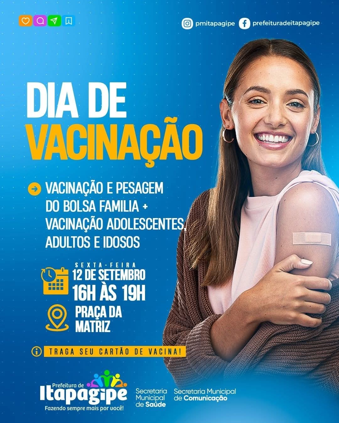 A Secretaria Municipal de Saúde, convida toda a população para participar do Dia de Vacinação e Pesagem do Bolsa Família, que será realizado na próxima sexta-feira, dia 12 de setembro, das 16h às 19h, na Praça da Matriz.