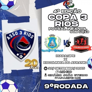 Nesta quarta-feira, dia 10, acontece a 9ª rodada da 4ª Copa 3 Rios de Futsal Infantil Estudantil.