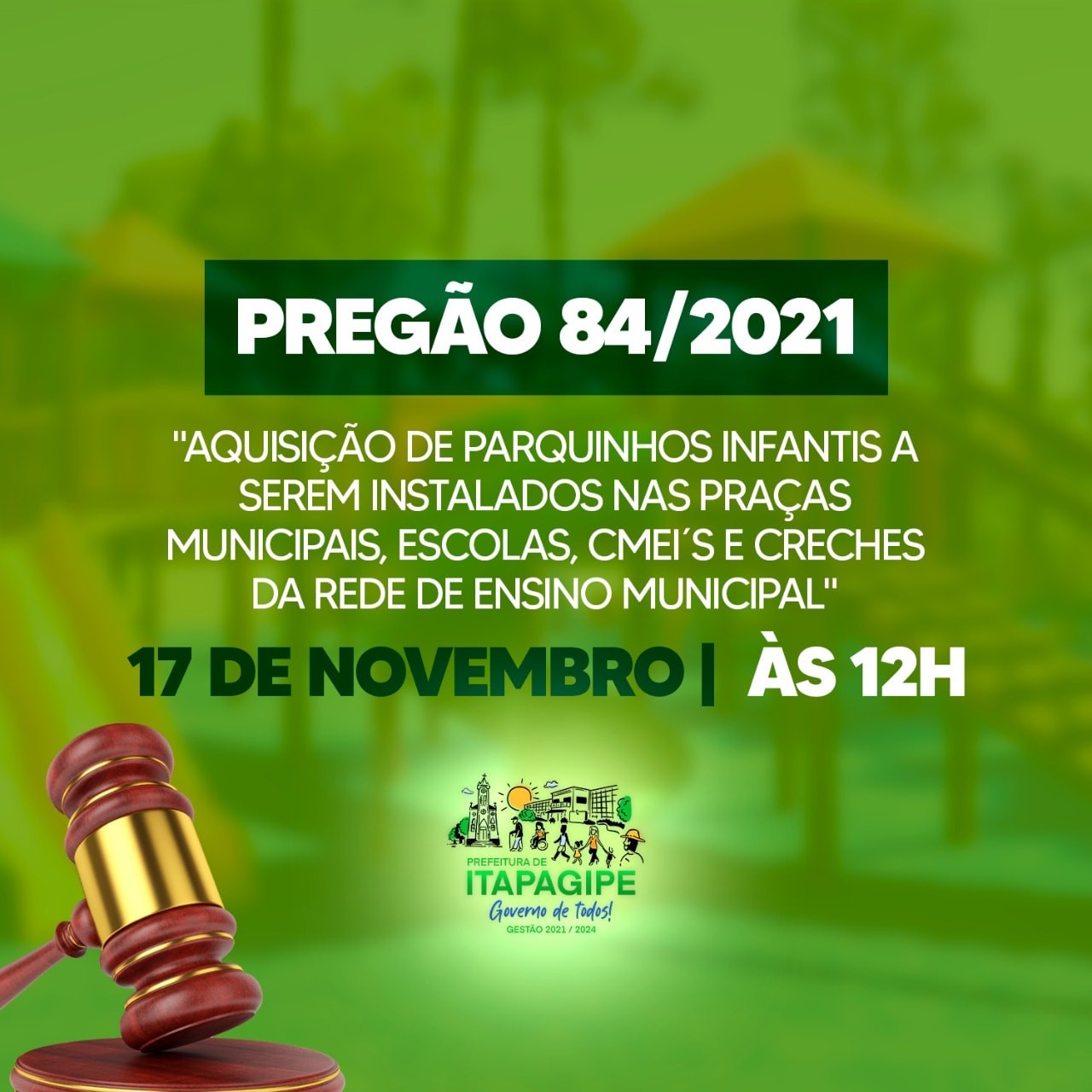 Nesta quarta-feira, dia 17 de novembro à partir das 12:00 da tarde, acontece o Pregão 84/2021, referente a aquisição de parquinhos infantis para as praças públicas, escolas, CMEI's e creches da rede de ensino municipal.