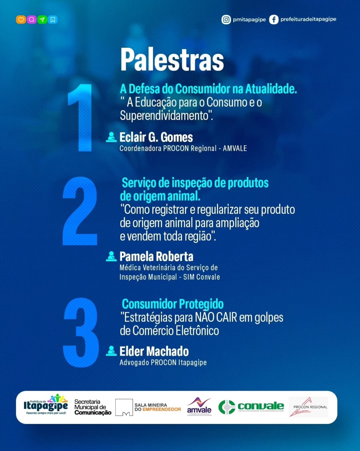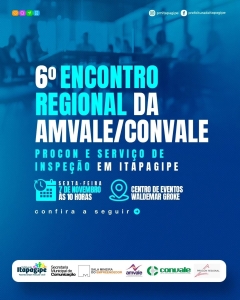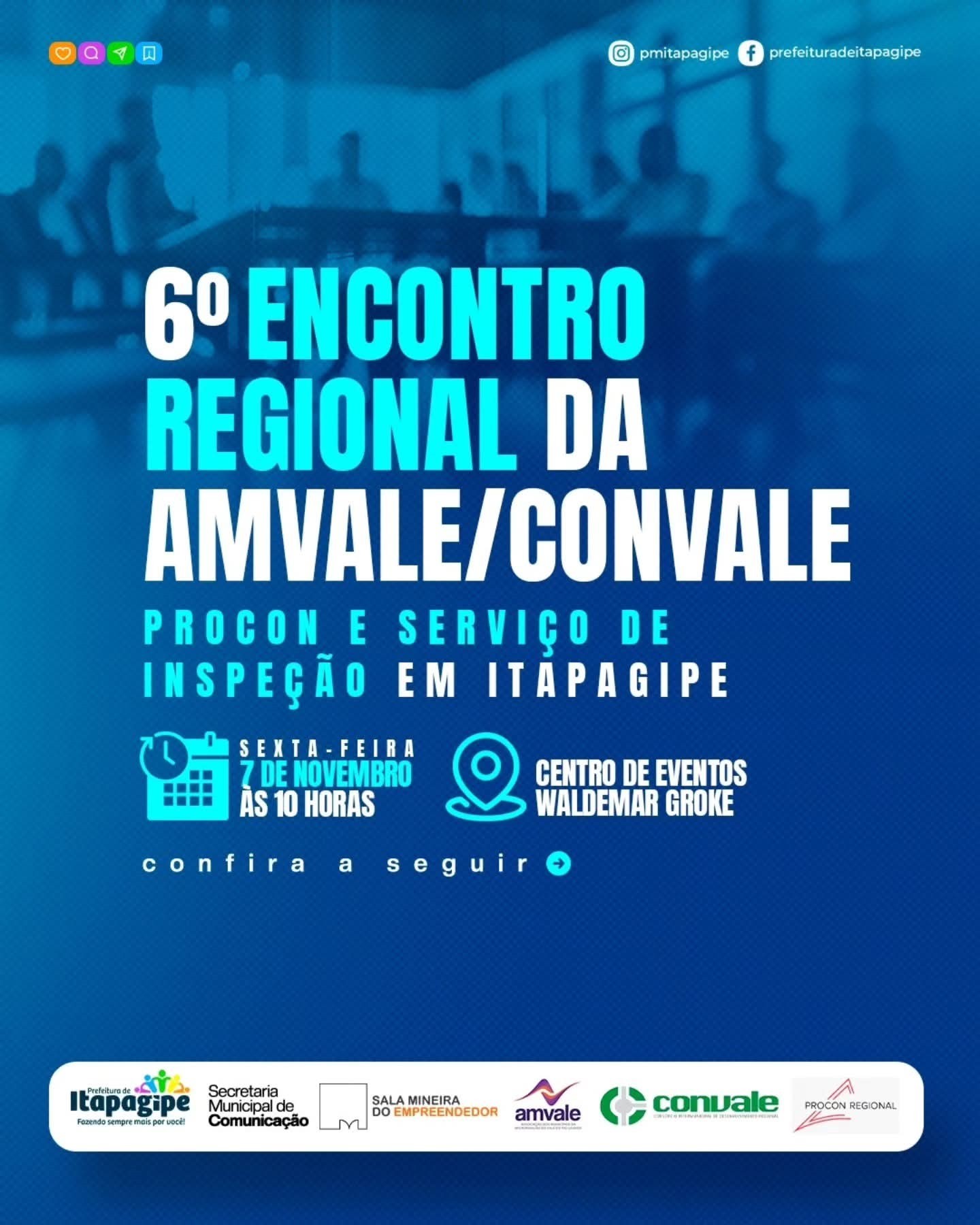 No dia 7 de novembro de 2025, Itapagipe será sede do 6º Encontro Regional da AMVALE/CONVALE – PROCON e Serviço de Inspeção, um importante evento que reunirá representantes municipais, produtores, comerciantes e a comunidade em geral para discutir temas voltados à defesa do consumidor e à regularização de produtos de origem animal.