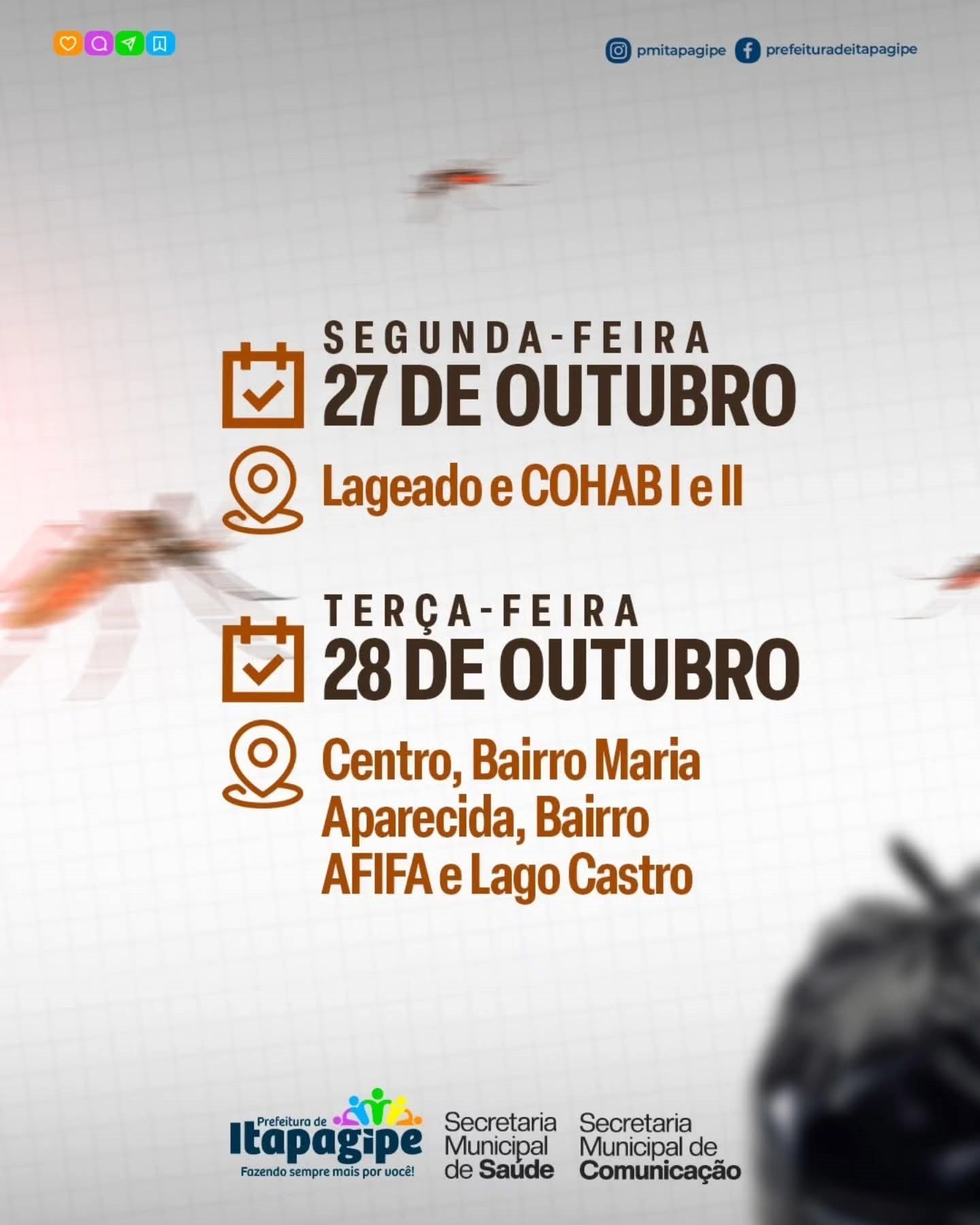 • 28/10 – Terça-feira: Centro, Bairro Maria Aparecida, Bairro AFIFA e Lago Castro