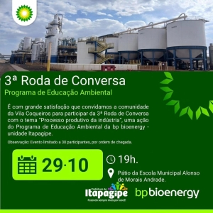 É com grande satisfação que convidamos toda a comunidade da Vila Coqueiros a participar da 3ª Roda de Conversa do Programa de Educação Ambiental da BP Bioenergy - unidade Itapagipe.