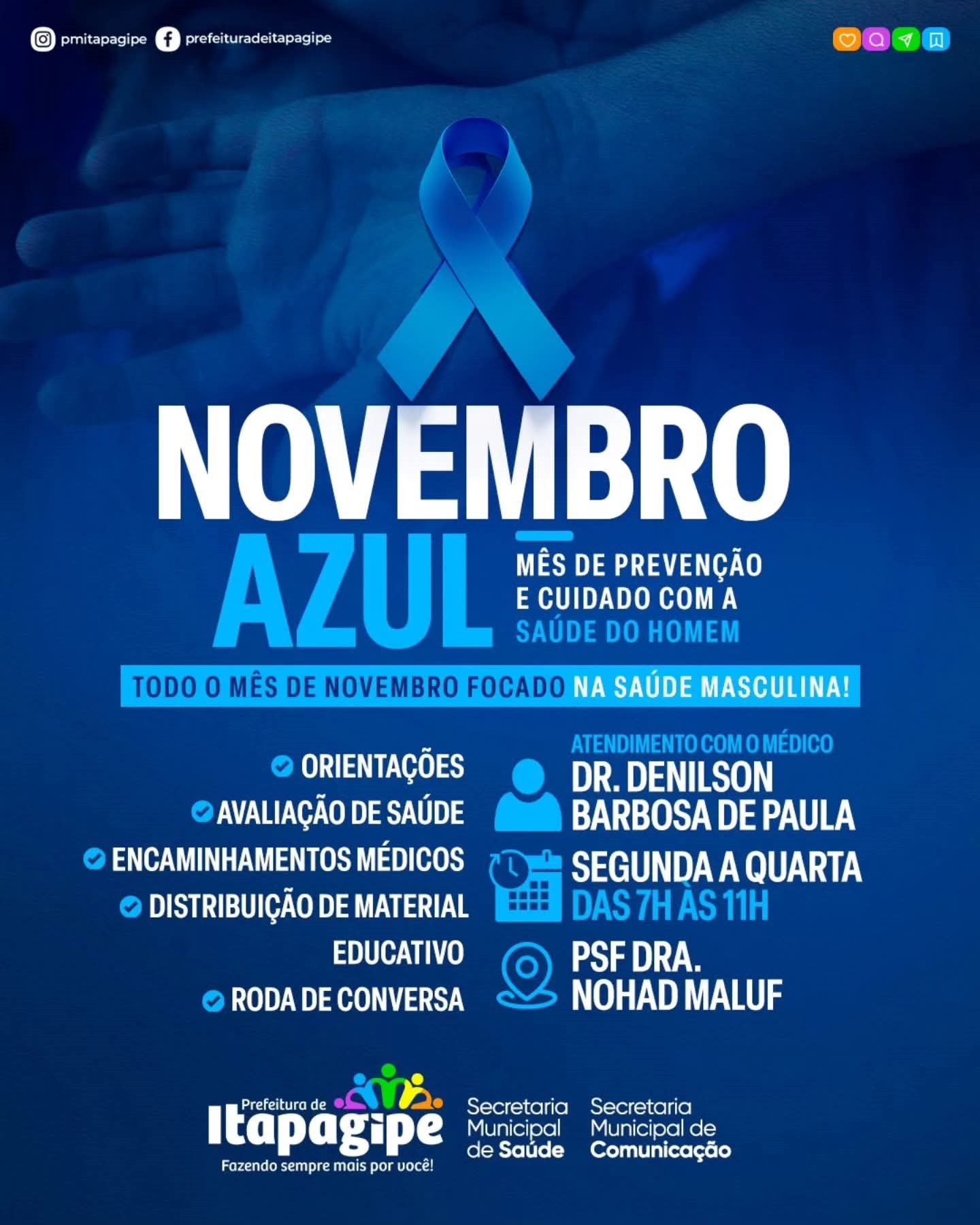 A Secretaria Municipal de Saúde convida todos os homens a participarem do Novembro Azul — “Ação de Prevenção ao Câncer de Próstata”, mês dedicado à promoção da saúde masculina.