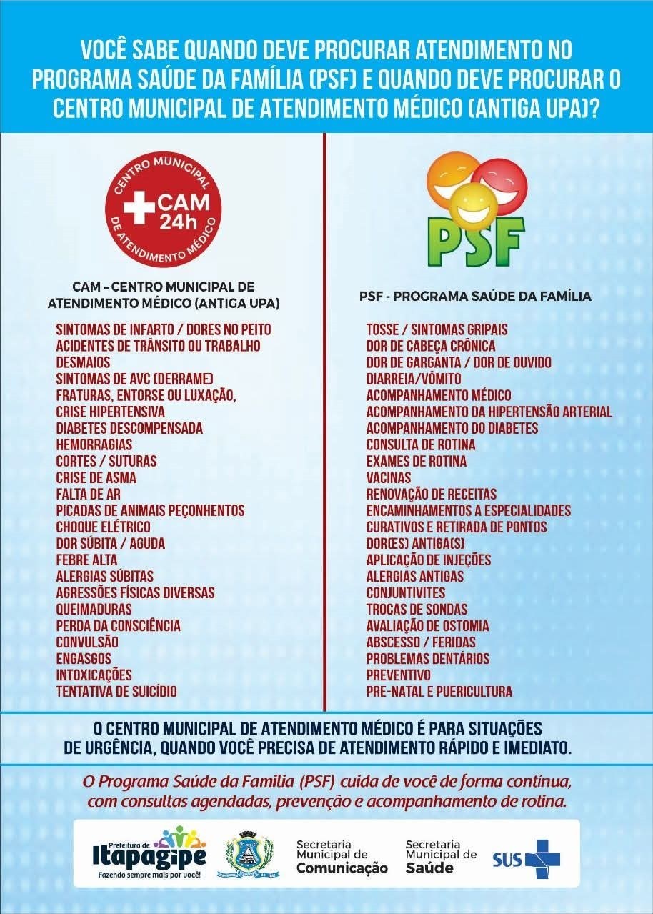 A Prefeitura Municipal de Itapagipe, por meio da Secretaria Municipal de Saúde (SMS), informa que irá adotar um novo protocolo de atendimento no Centro Municipal de Atendimento Médico 24h (CAM), antiga UPA.
