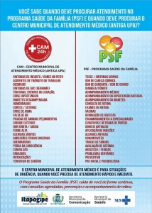 Assim, ao chegar à unidade, o paciente será orientado quanto ao tipo de atendimento indicado, compreendendo quais situações devem ser direcionadas ao Programa de Saúde da Família (PSF) e quais devem ser atendidas no CAM.