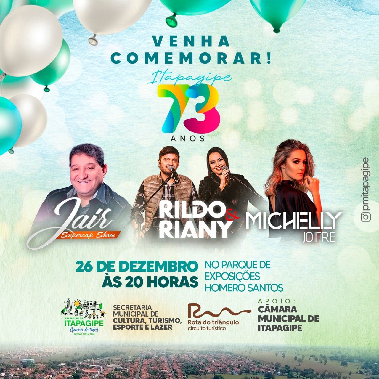 Além do Natal de Todos, evento promovido pela Aciita e CDL e comércio local que sorteará R$ 25.000,00 em prêmios à partir das 19:00 horas, teremos show de Rildo & Riany, Jair Supercap Show e DJ Michelly Joifre, à partir das 20:00 horas da noite, no Parque de Exposições Homero Santos.