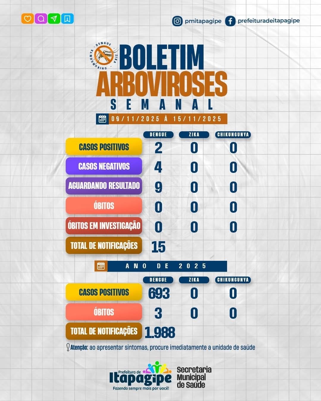 A Prefeitura de Itapagipe, por meio da Secretaria Municipal de Saúde, divulga o boletim epidemiológico e orienta a população a tomar as medidas necessárias para prevenir a proliferação do mosquito Aedes aegypti.