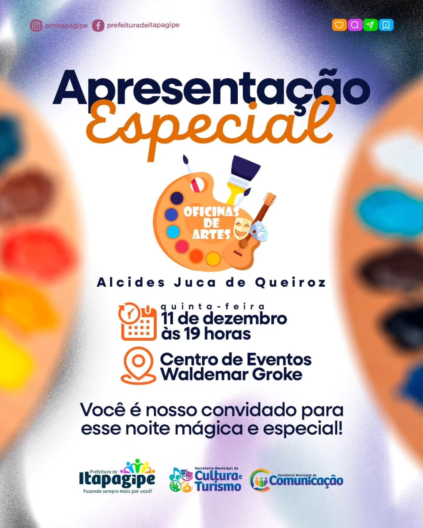 A Secretaria Municipal de Cultura convida você para o encerramento das Oficinas de Artes Alcides Juca de Queiroz, que será realizado no dia 11 de dezembro, às 19h, no Centro de Eventos Waldemar Groke.