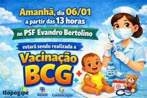 A Secretaria Municipal de Saúde informa que, nesta terça-feira (06), o PSF Evandro Bertolino realizará a vacinação BCG, a partir das 13 horas. A imunização é destinada principalmente a recém-nascidos e tem papel fundamental na prevenção das formas graves da tuberculose.