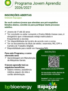 A Usina BP Bioenergy - Unidade Itapagipe, em parceria com a Prefeitura de Itapagipe, informa a abertura das inscrições para o Programa Jovem Aprendiz 2026/2027, iniciativa que visa promover a qualificação profissional e ampliar as oportunidades de inserção dos jovens no mercado de trabalho. Ao todo, serão ofertadas 16 vagas.