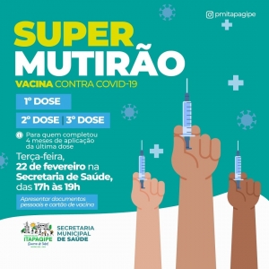 Hoje, terça-feira, dia 22 de fevereiro, acontece mais um supermutirão de vacinação contra a Covid-19.