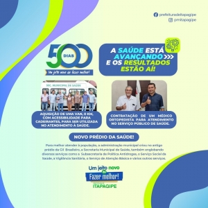 Reformamos diversos prédios da saúde, como os PSF Dr. Edison Rodrigues, criamos um espaço dedicado à Secretaria de Saúde, onde funcionam os serviços de agendamento de ambulância, assistência da saúde, vigilância sanitária e outros serviços essenciais a população.