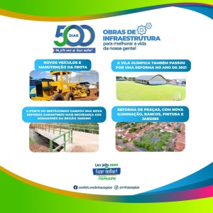 Durante esses dias adquirimos novos equipamentos e veículos para a frota municipal, reformamos a Vila Olímpica, reformamos as praças públicas e a ponte de Sertãozinho.