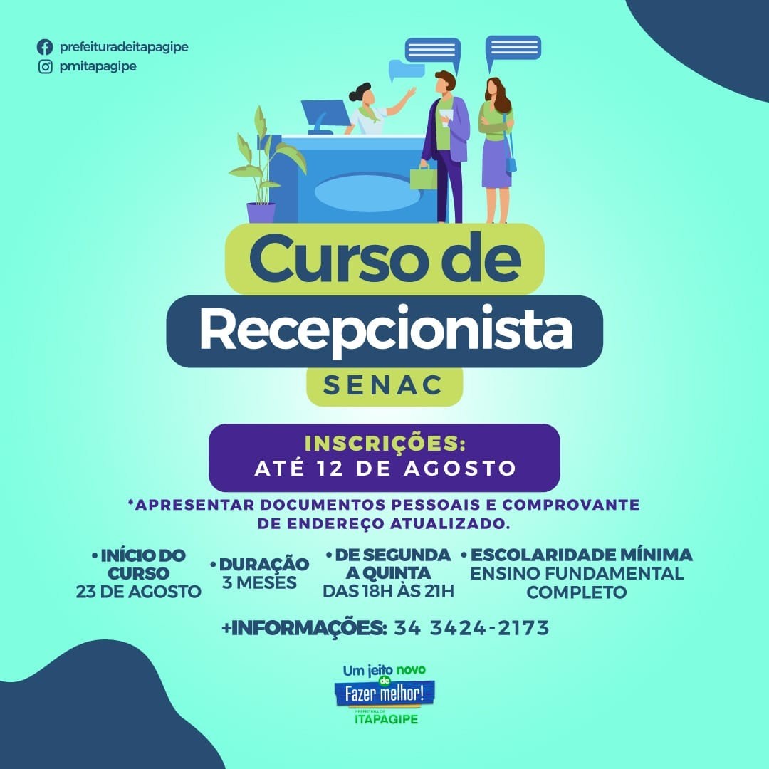 Estão abertas as inscrições para o curso de Recepcionista disponibilizado pelo SENAC em parceria com a Prefeitura de Itapagipe.