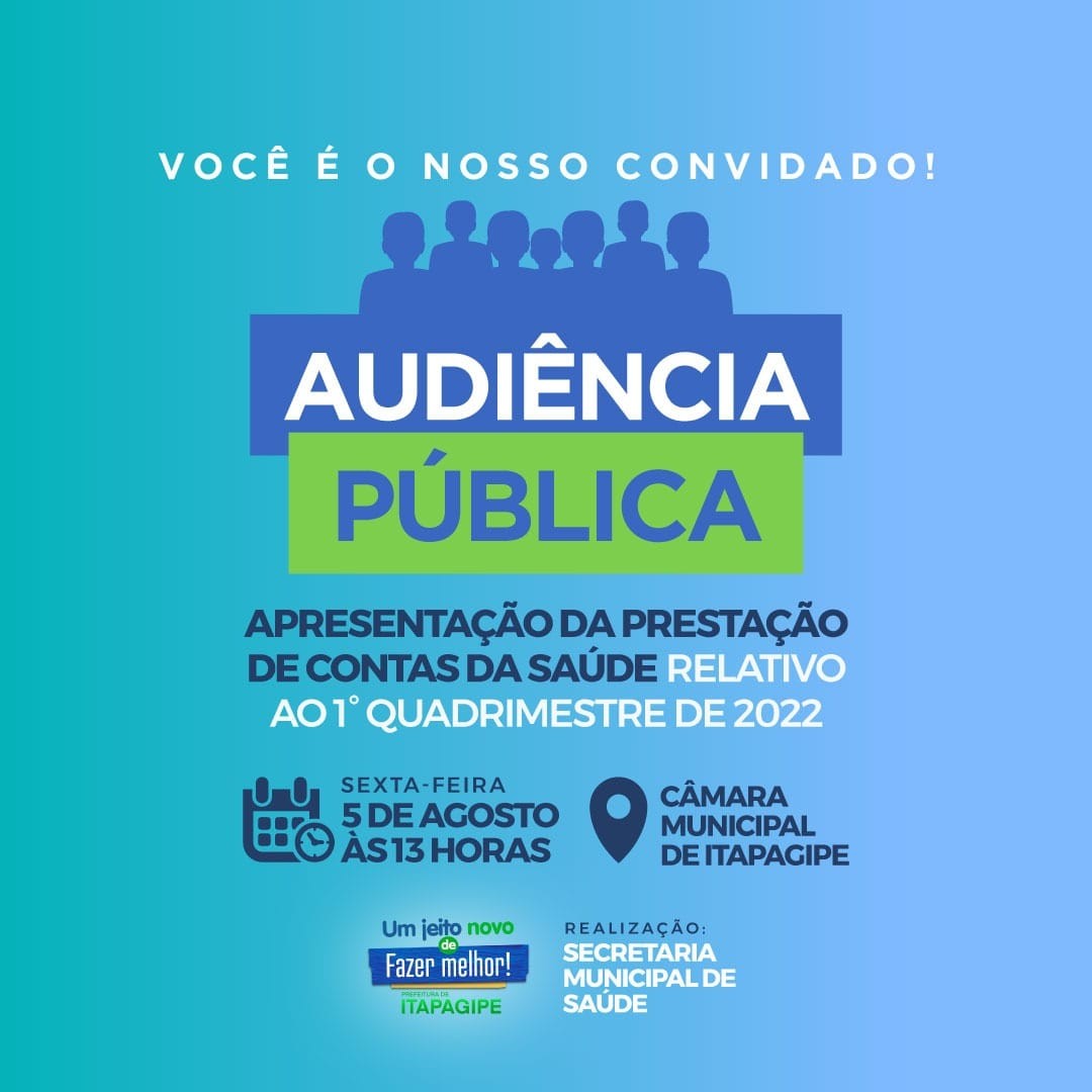 Nesta sexta-feira, dia 05 de agosto, a partir das 13:00, acontece uma audiência pública na Câmara Municipal de Itapagipe referente a prestação de contas da saúde referente ao primeiro quadrimestre de 2022.