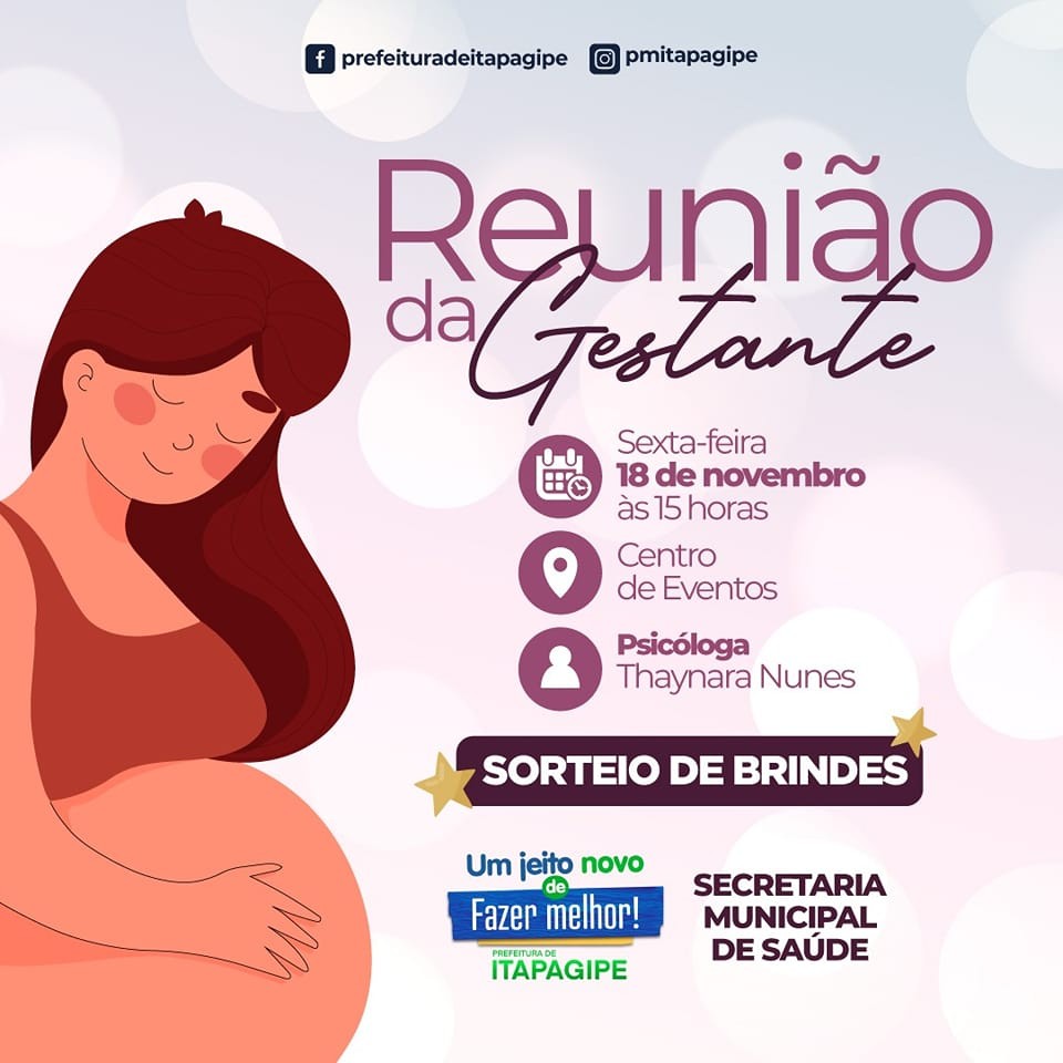 Dia 18 de novembro, acontece a Reunião da Gestante, no Centro de Eventos à partir das 15:00.