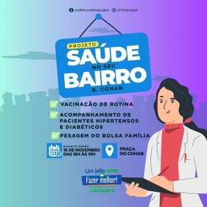 Atenção moradores da COHAB I E II, nesta quarta-feira, dia 16 de novembro, nossa equipe da saúde estará na Praça da COHAB para realizar mais uma etapa do projeto Saúde No Seu Bairro!