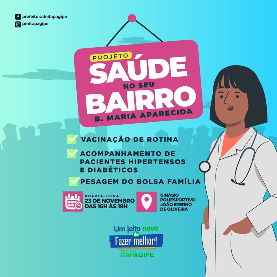 Atenção moradores da bairro Maria Aparecida, nesta quarta-feira, dia 23 de novembro, nossa equipe da saúde estará no Ginásio Poliesportivo João Eterno de Oliveira, para realizar mais uma etapa do projeto Saúde No Seu Bairro!
